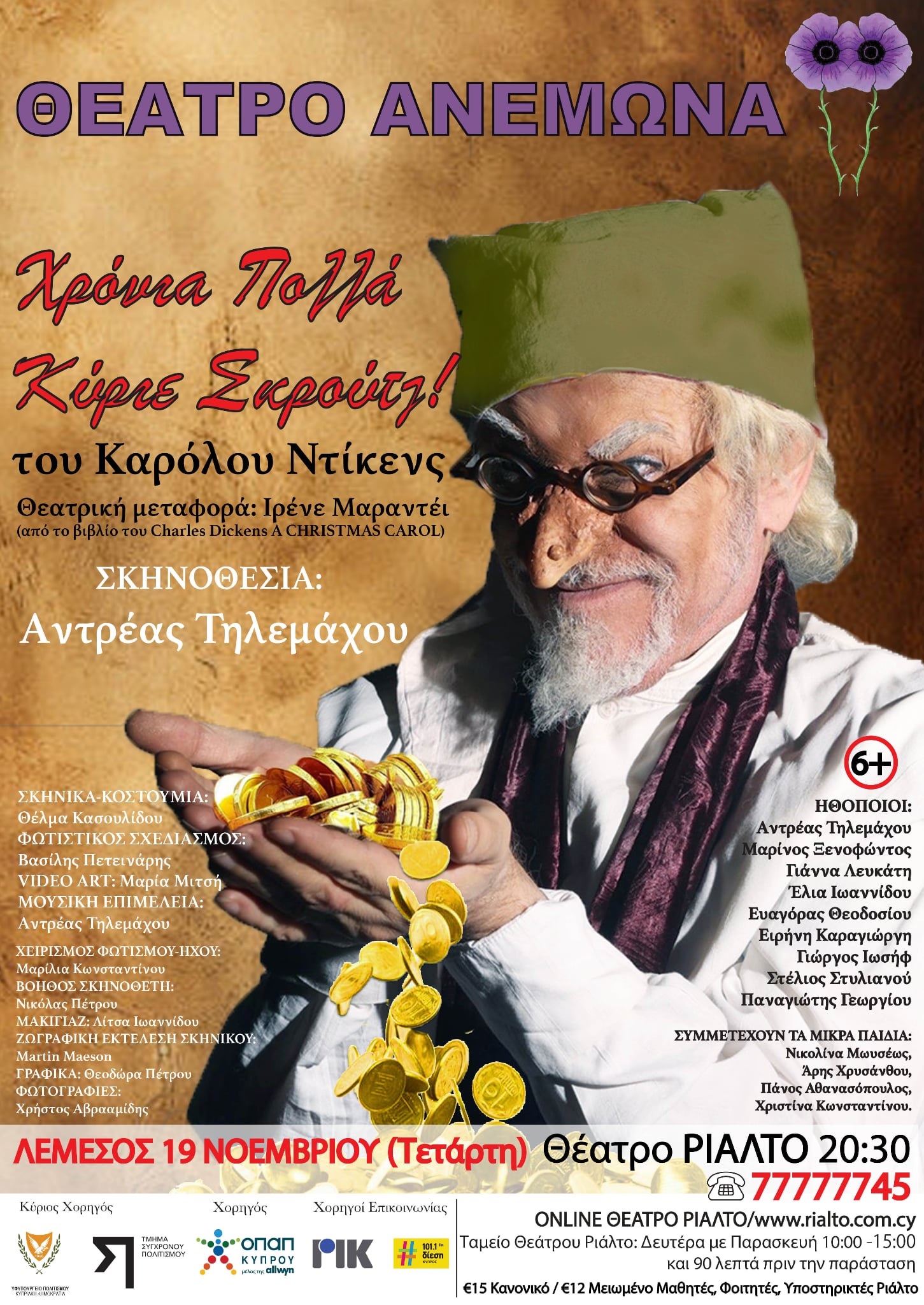 Θεατρική μεταφορά του αριστουργήματος του Charles Dickens "A Christmas Carol". Η κλασική νουβέλα πραγματεύεται τη συναισθηματική και ηθική μεταστροφή του Εμπενίζερ Σκρουτζ, ενός από τους πιο απολαυστικούς μισανθρώπους της παγκόσμιας λογοτεχνίας και είναι ένα από τα πιο πολυδιαβασμένα βιβλία όλων των εποχών. Μεταφέρθηκε δεκάδες φορές στον κινηματογράφο, στην τηλεόραση και το θέατρο, ανέβηκε σε μιούζικαλ και οπερέτες, έγινε εικονογραφημένη σειρά κόμικς, σειρά κινουμένων σχεδίων κλπ ενώ παραμένει στις μέρες μας τραγικά επίκαιρη. Στόχος, οι θεατές να ταξιδέψουν στο χρόνο, να βιώσουν τη θεατρική μαγεία, να αισθανθούν ξανά παιδιά και έφηβοι, να προβληματιστούν, να συγκινηθούν και να γελάσουν, φεύγοντας στο τέλος πιο ανάλαφροι. Μια θεατρική πρόταση για όλη την Οικογένεια!